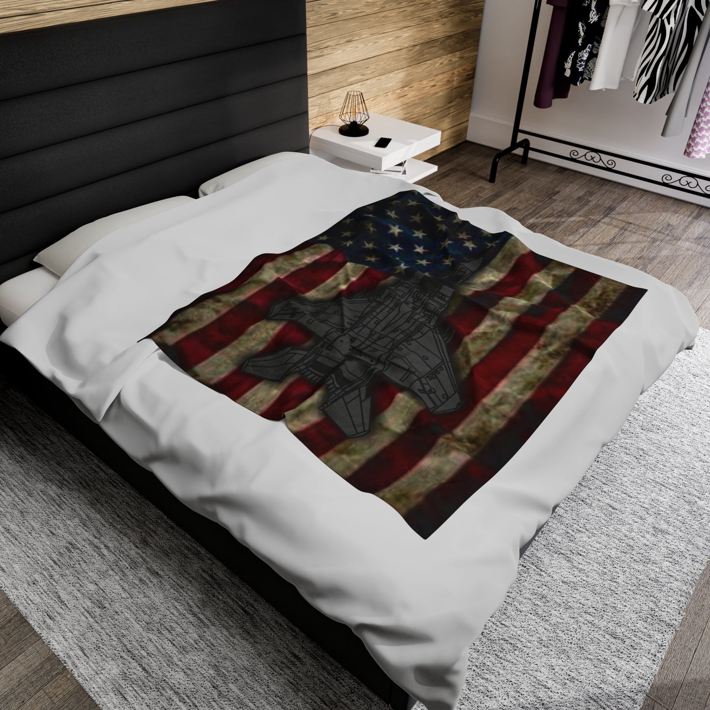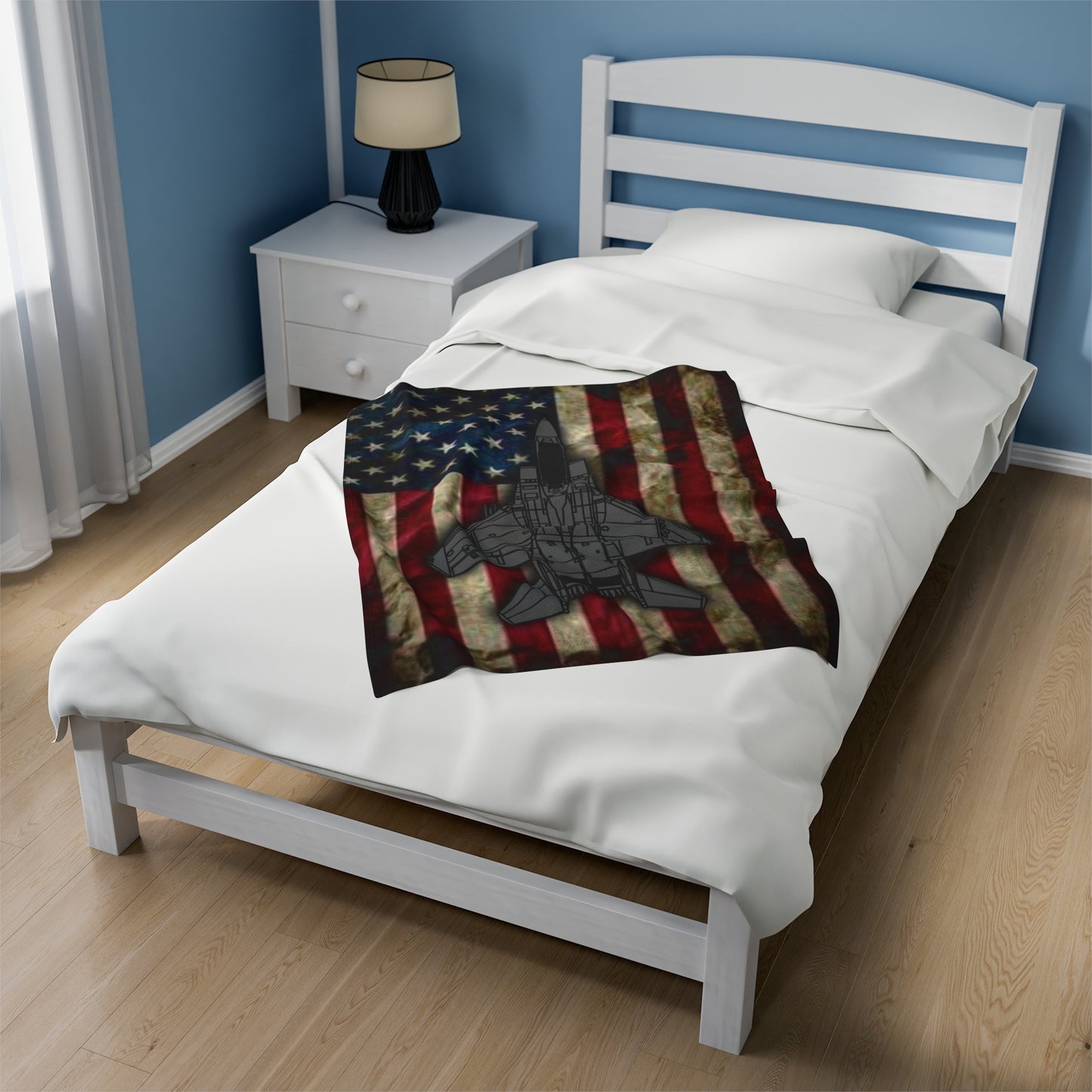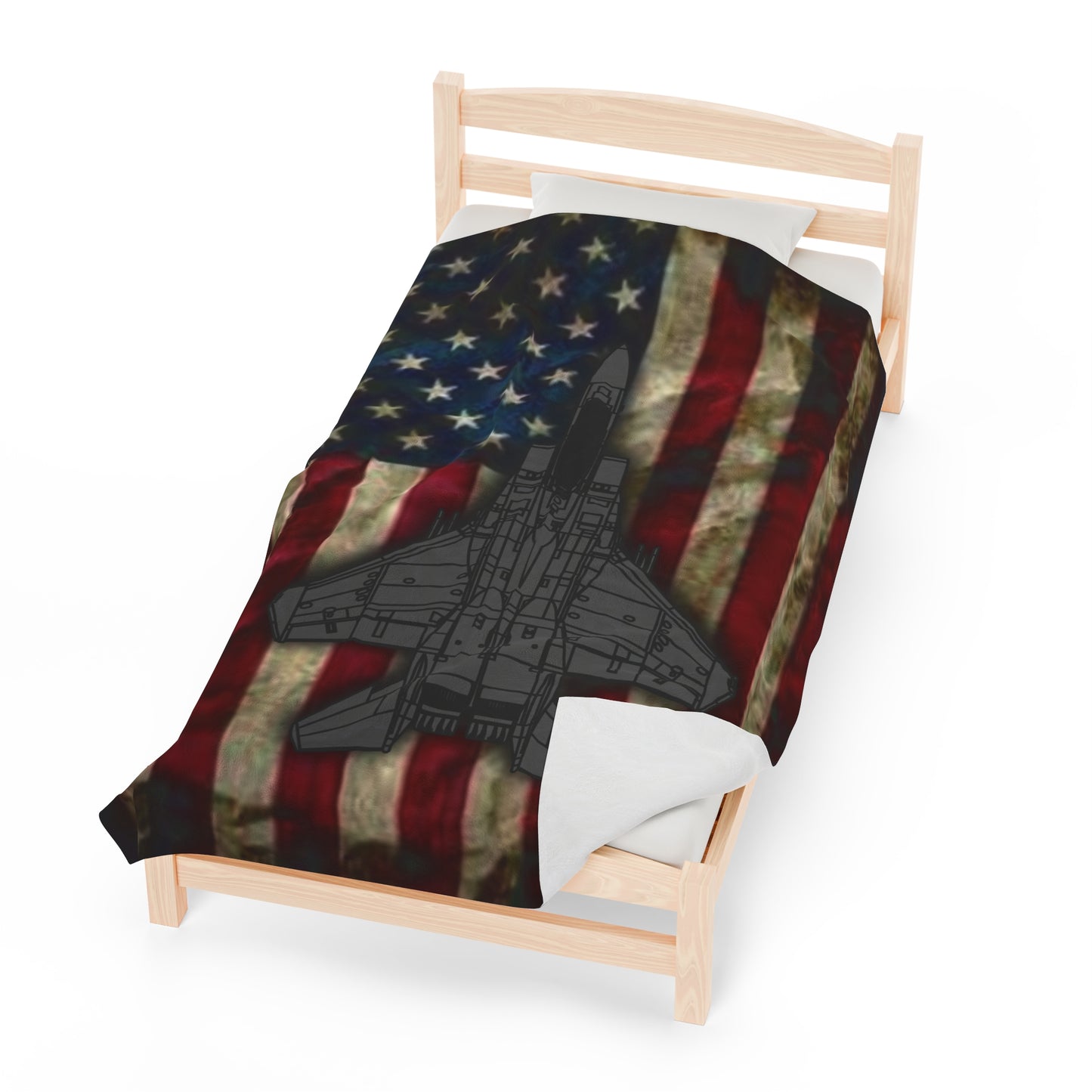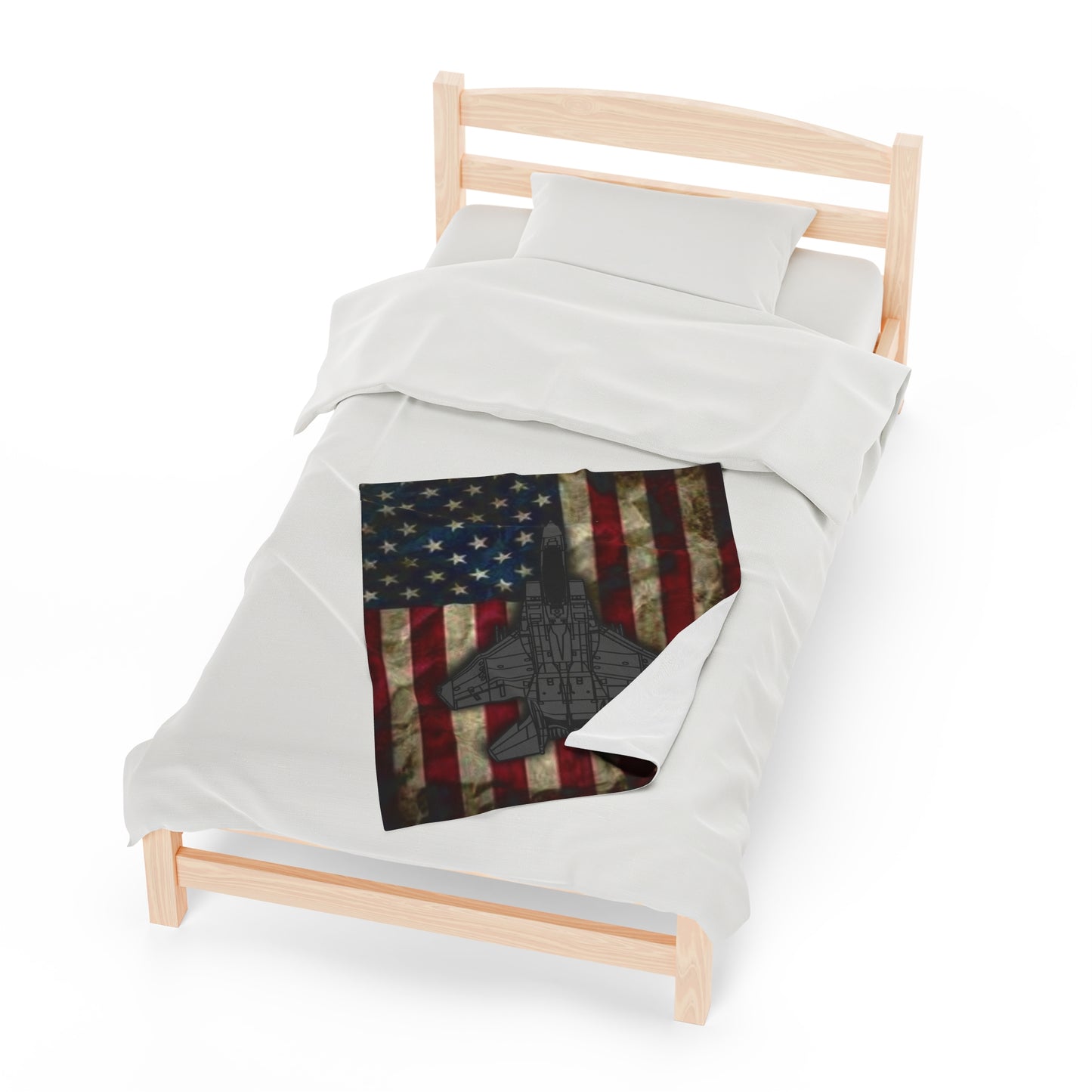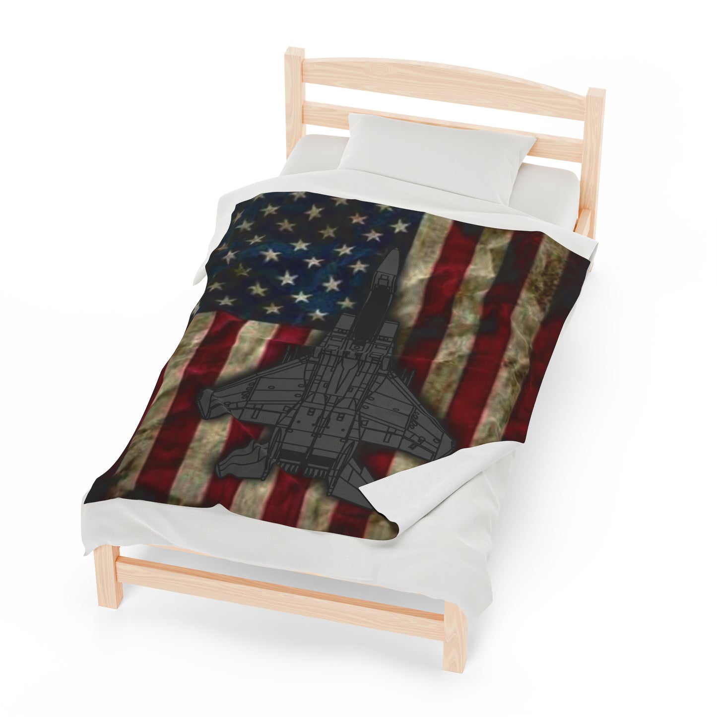 Velveteen Plush Blanket - F-15E Fighter Jet with Old Glory American Flag