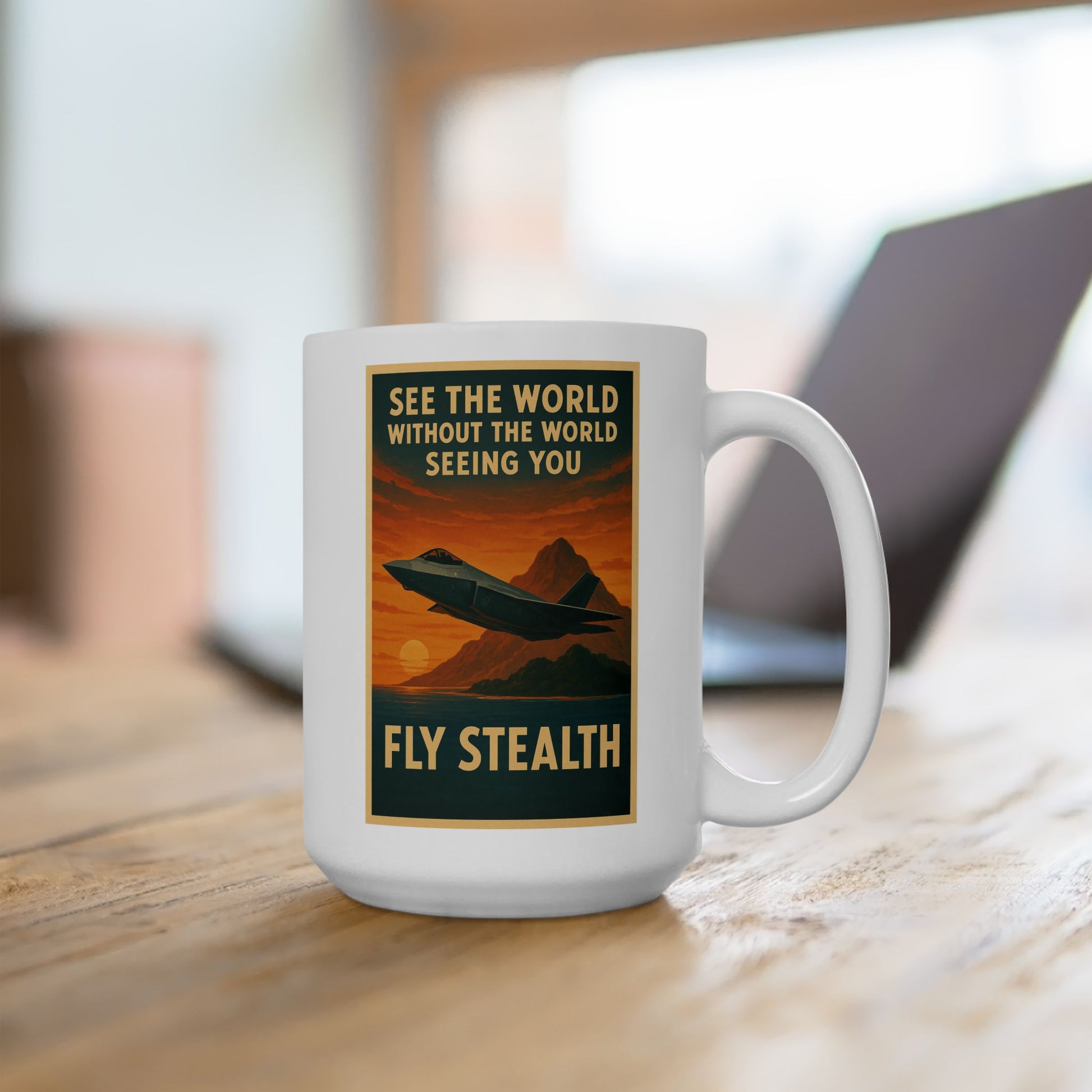 Fly Stealth F-35 Travel Poster Themed 15oz Ceramic Mug. Perfect gift for pilots or aviation enthusiasts. Adds a touch of excitement to your morning coffee routine. Ideal for birthdays, Father's Day, or any special occasion.