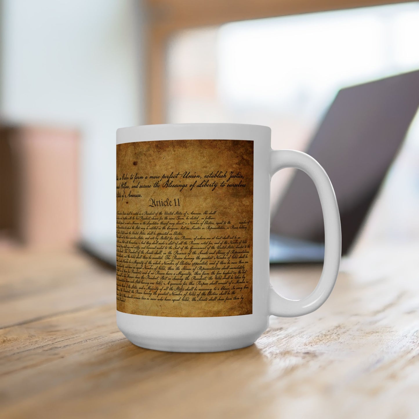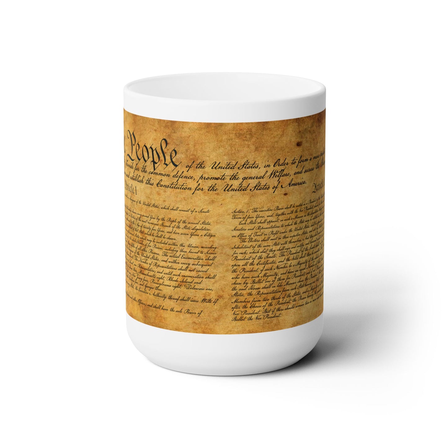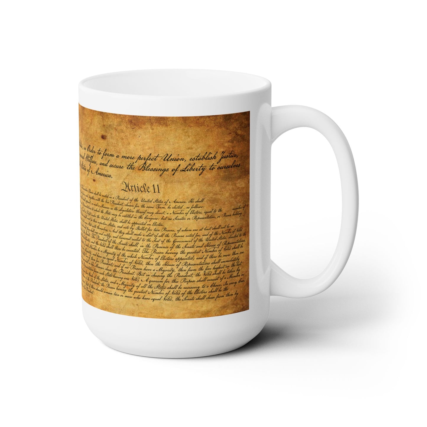 Show your support for our Constitution! 15oz ceramic mug is perfect for enjoying your cup of joe and remembering what makes our nation great. Perfect gift for history buffs, active and retired military members, or anyone proud of our nation!